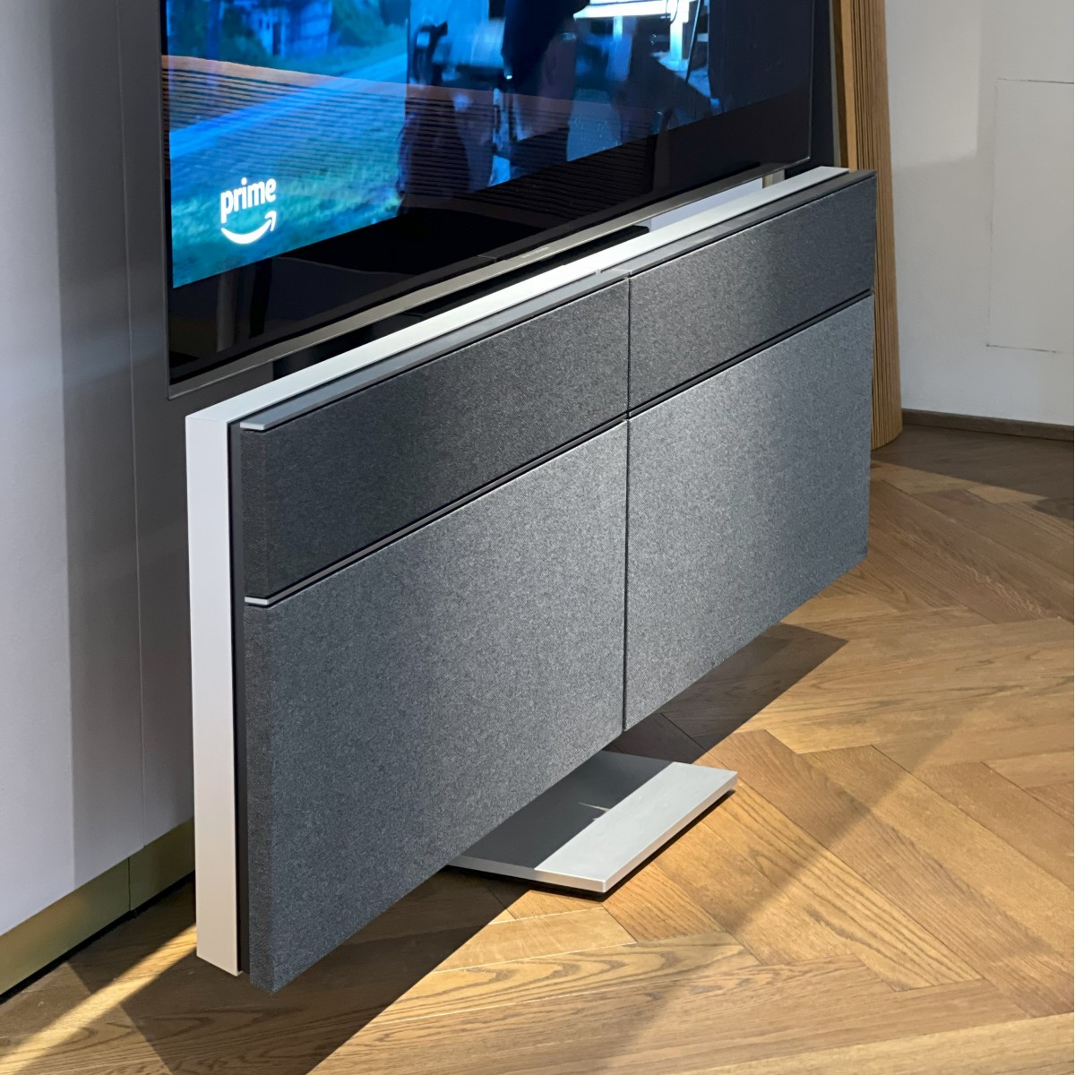 BeoVision Harmony 65" er et mesterværk af dansk design og ingeniørkunst. De to Grey Melange frontpaneler åbner sig som vinger, når TV’et tændes, og lukker sig harmonisk, når det slukkes – en bevægelse, der gør teknologien levende.
