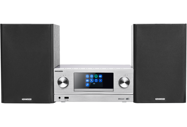 Se fuld størrelse Kenwood M-9000S-S er et stilrent kompakt minianlæg i sølv med kraftig lyd, CD-afspiller, FM/AM-radio og trådløs Bluetooth-streaming – perfekt til hjemmet, køkkenet eller kontoret.